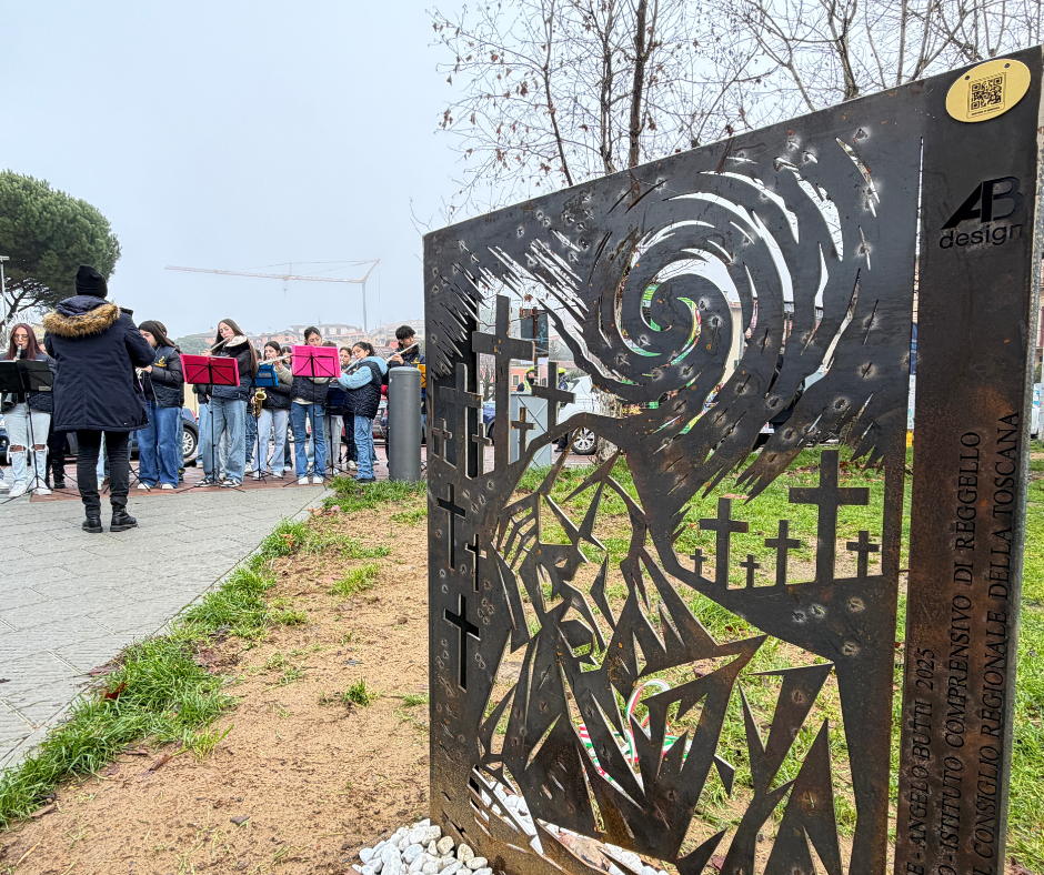 È stata inaugurata questa mattina nel giardino di piazza Aldo Moro a Reggello la scultura “Sentieri di Memorie”, opera dell’architetto e artista Angelo Butti, nata dal lavoro di ricerca e riflessione degli studenti e delle studentesse dell’Istituto Comprensivo di Reggello sulla memoria storica locale legata alla Seconda guerra mondiale.