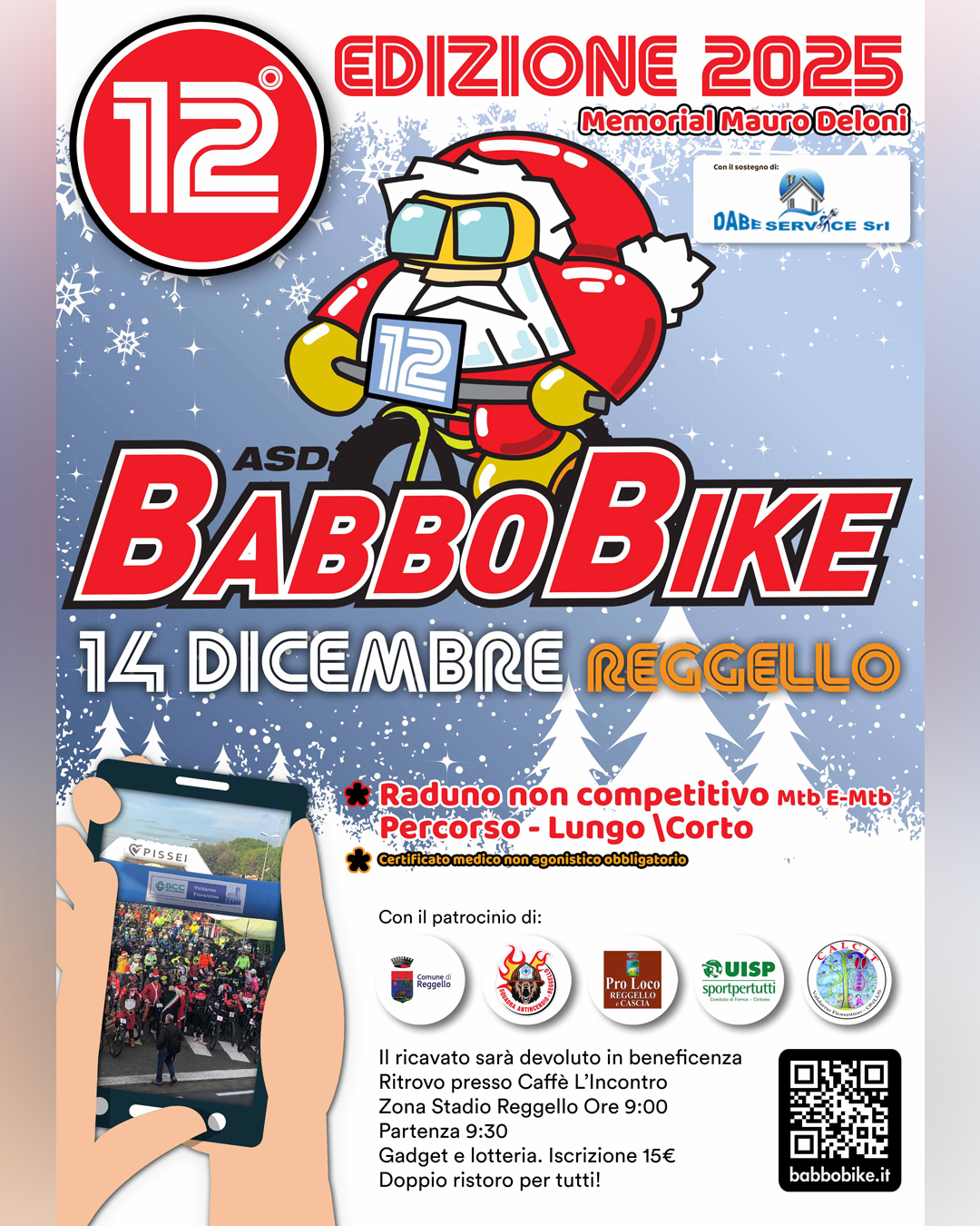 12ª edizione della Babbobike - raduno mtb e.mtbCondividi Facebook Twitter Linkedin Telegram WhatsappVedi azioni Scarica Stampa E-mailTipo di eventoRaduno sportivoImageNatale a Reggello 2025 2026 Cos'è 12ª edizione della Babbobike - raduno mtb e.mtb, a cura dell’ASD BabboBike A chi è rivolto a tutte/i Luogo Palazzo ComunalePiazza Roosevelt,1 - 50066 ReggelloLeggi tuttoa proposito di Palazzo ComunaleGalleria di immaginiImage202514Dic 09:30 - Inizio evento 202514Dic 14:00 - Fine evento Costo Info: https://www.babbobike.it/ Contatti Iniziative-Eventi info@comune.reggello.fi.it Patrocinato da Comune di Reggello