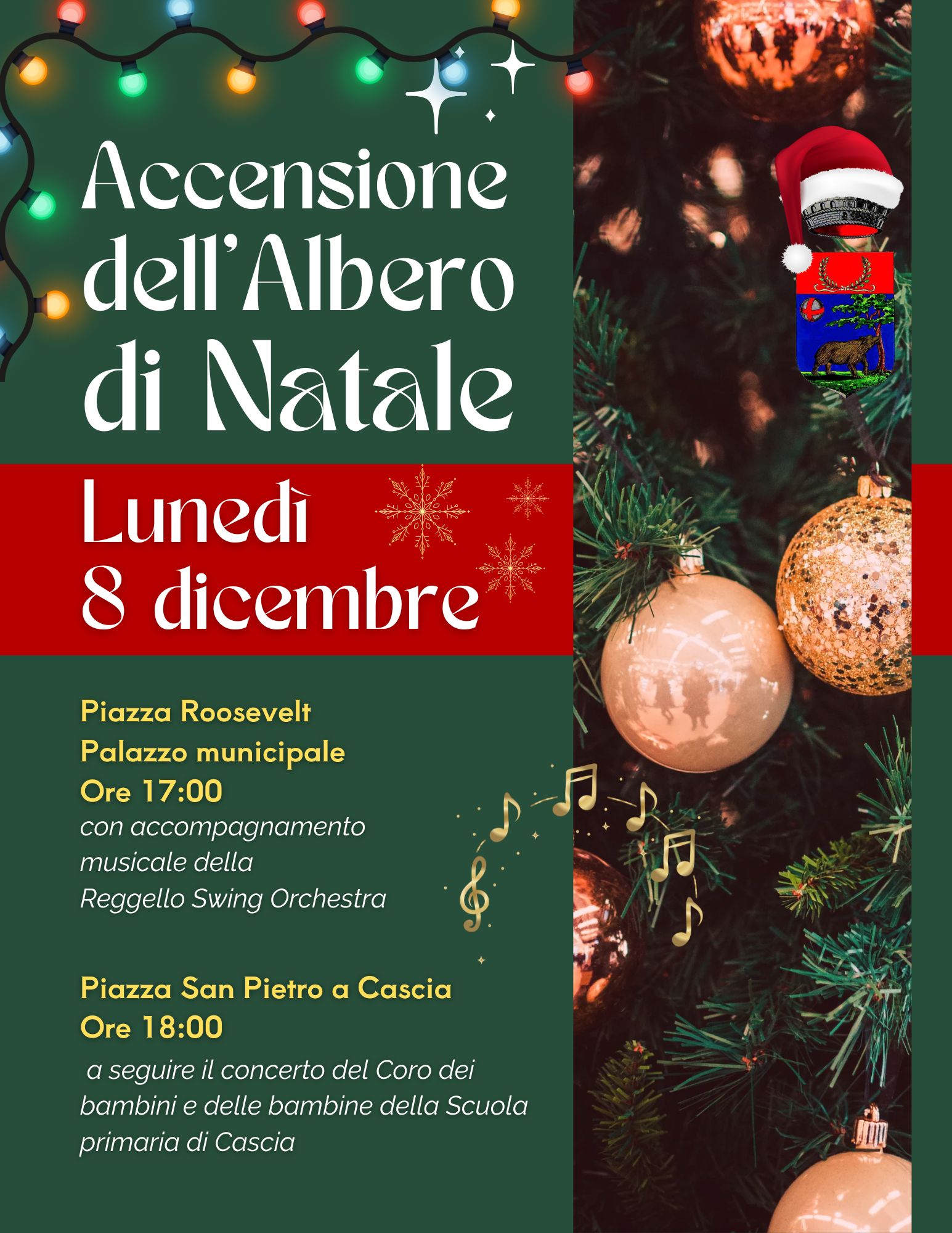 Accensione dell'Albero di Natale - ReggelloCondividi Facebook Twitter Linkedin Telegram WhatsappVedi azioni Scarica Stampa E-mailTipo di eventoEvento culturaleImageNatale a Reggello 2025 2026 Cos'è Accensione dell'Albero di Natale - Reggello con accompagnamento musicale della Reggello Swing Orchestra A chi è rivolto a tutte/i Luogo Palazzo ComunalePiazza Roosevelt,1 - 50066 ReggelloLeggi tuttoa proposito di Palazzo ComunaleGalleria di immaginiImage202508Dic 17:00 - Inizio evento 202508Dic 18:00 - Fine evento Costo nessun costo Contatti Iniziative-Eventi info@comune.reggello.fi.it