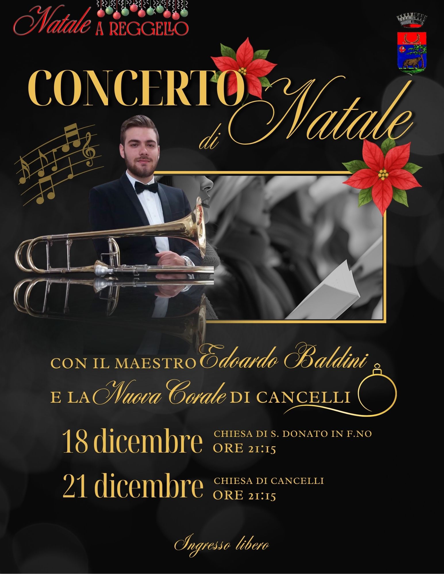 Concerto di NataleCondividi Facebook Twitter Linkedin Telegram WhatsappVedi azioni Scarica Stampa E-mailTipo di eventoManifestazione musicaleImageNatale a Reggello 2025 2026 Cos'è Concerto di Natale con il maestro Edoardo Baldini e la Nuova Corale di Cancelli A chi è rivolto a tutte/i Luogo San Donato in FronzanoSan Donato in Fronzano - 50066 ReggelloLeggi tuttoa proposito di San Donato in FronzanoGalleria di immaginiImage202518Dic 21:15 - Inizio evento 202518Dic 23:15 - Fine evento Costo ingresso libero Contatti Iniziative-Eventi info@comune.reggello.fi.it