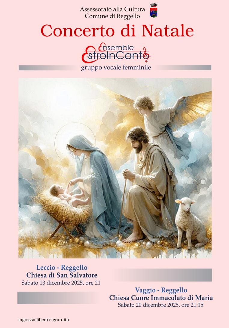 Concerto di Natale Ensemble “EstroInCanto”Condividi Facebook Twitter Linkedin Telegram WhatsappVedi azioni Scarica Stampa E-mailTipo di eventoManifestazione musicaleImageNatale a Reggello 2025 2026 Cos'è Concerto di Natele Ensemble “EstroInCanto” A chi è rivolto a tutte/i Luogo Vaggiovaggio - 50066 reggelloLeggi tuttoa proposito di VaggioGalleria di immaginiImage202520Dic 21:15 - Inizio evento 202520Dic 23:15 - Fine evento Costo ingresso libero Contatti Iniziative-Eventi info@comune.reggello.fi.it