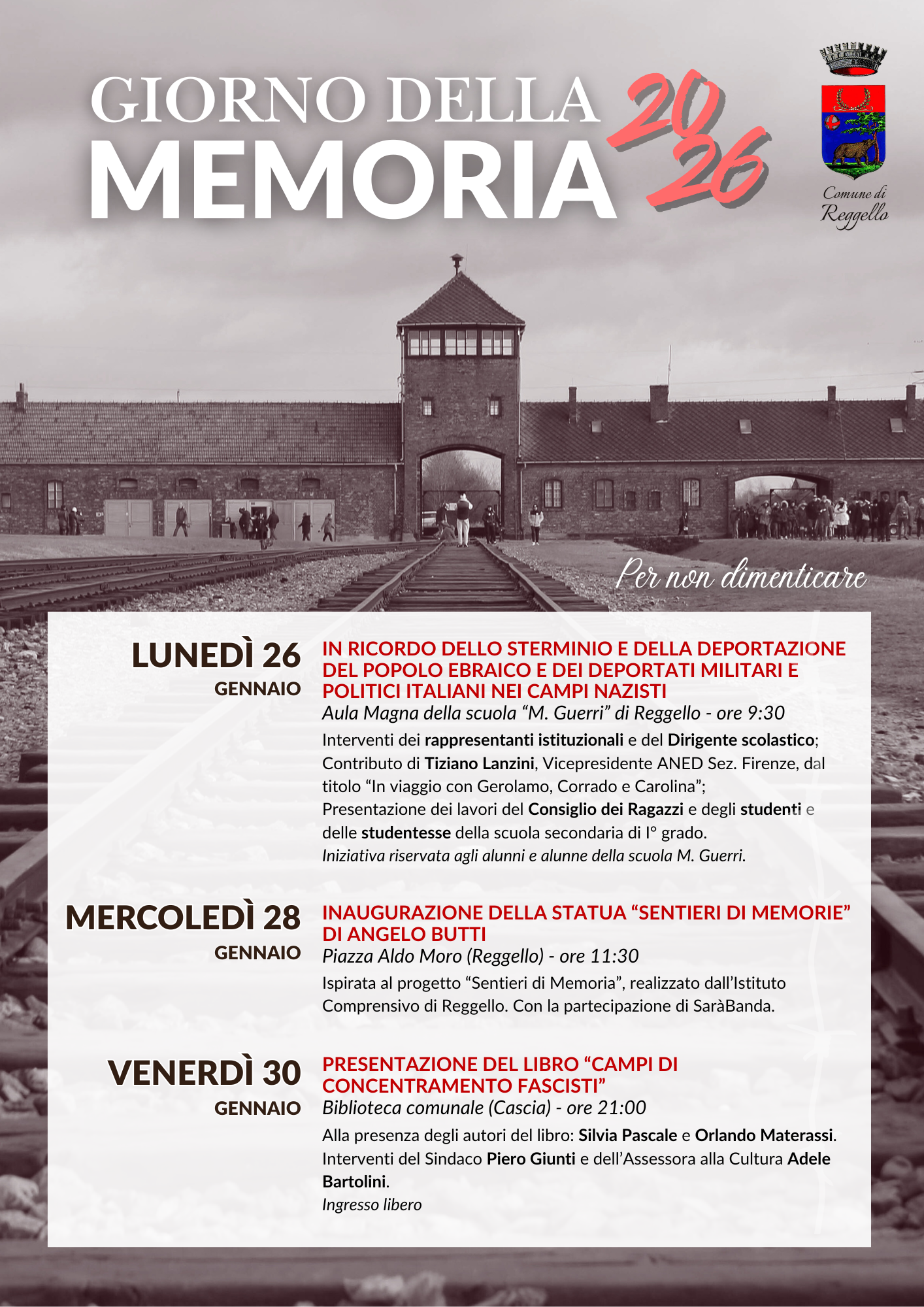 Lunedì 26 , alle ore 9.30, presso l’Aula Magna della scuola “M. Guerri” di Reggello, con un’iniziativa riservata agli alunni e alle alunne dell’istituto. Dopo i saluti dei rappresentanti istituzionali e del Dirigente scolastico, è previsto il contributo di Tiziano Lanzini, vicepresidente ANED – sezione di Firenze, dal titolo “In viaggio con Gerolamo, Corrado e Carolina”, seguito dalla presentazione dei lavori realizzati dal Consiglio dei Ragazzi e dagli studenti e dalle studentesse della scuola secondaria di primo grado.