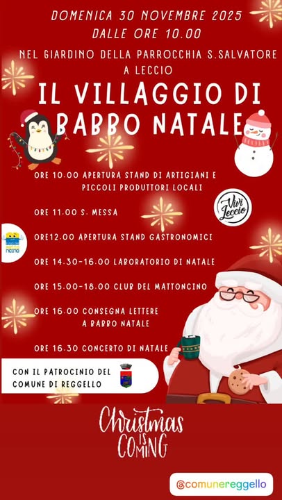 Il villaggio di Babbo NataleCondividi Facebook Twitter Linkedin Telegram WhatsappVedi azioni Scarica Stampa E-mailTipo di eventoEvento culturaleImagerosso b ok eventi Cos'è Leggi il volantino in allegato A chi è rivolto a tutti/e Luogo LeccioLeccio - 50066 ReggelloLeggi tuttoa proposito di LeccioGalleria di immaginiImage202530Nov 10:00 - Inizio evento 202530Nov 17:00 - Fine evento Costo partecipazione gratuita Contatti Iniziative-Eventi info@comune.reggello.fi.it