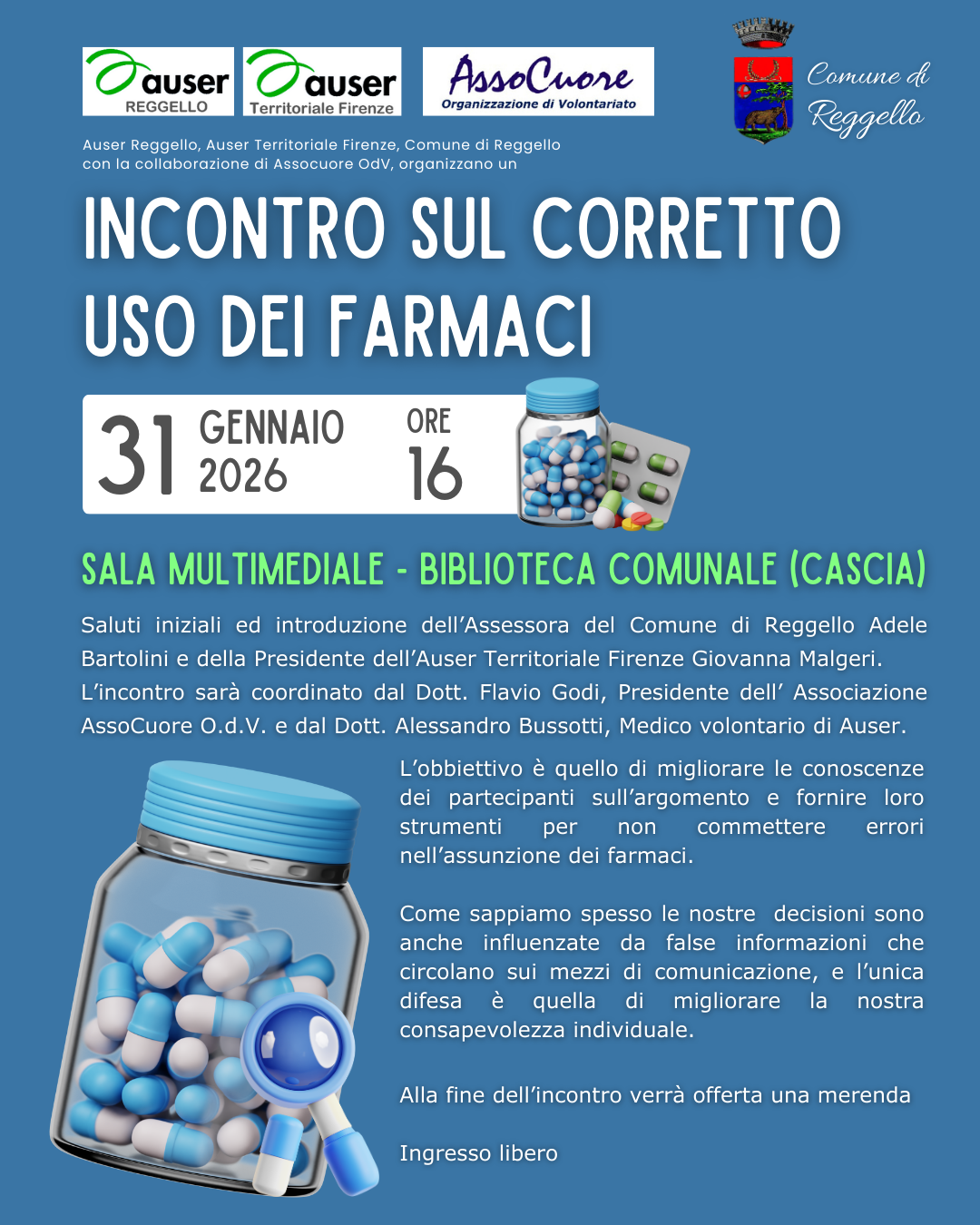 Sabato 31 gennaio si terrà a Reggello un incontro informativo dedicato al corretto uso dei farmaci, rivolto a tutta la cittadinanza.