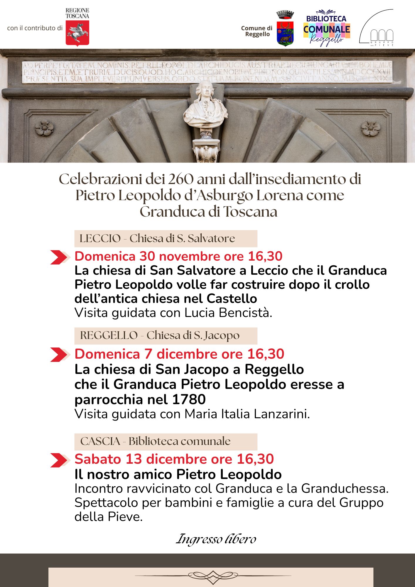 La chiesa di San Jacopo a Reggello che il Granduca Pietro Leopoldo eresse a parrocchia nel 1780Condividi Facebook Twitter Linkedin Telegram WhatsappVedi azioni Scarica Stampa E-mailTipo di eventoVisita guidataImageNatale a Reggello 2025 2026 Cos'è La chiesa di San Jacopo a Reggello che il Granduca Pietro Leopoldo eresse a parrocchia nel 1780, visita guidata con Maria Italia Lanzarini A chi è rivolto a tutte/i Luogo Palazzo ComunalePiazza Roosevelt,1 - 50066 ReggelloLeggi tuttoa proposito di Palazzo ComunaleGalleria di immaginiImage202507Dic 16:30 - Inizio evento 202507Dic 16:30 - Fine evento Costo nessun costo Contatti Iniziative-Eventi info@comune.reggello.fi.it