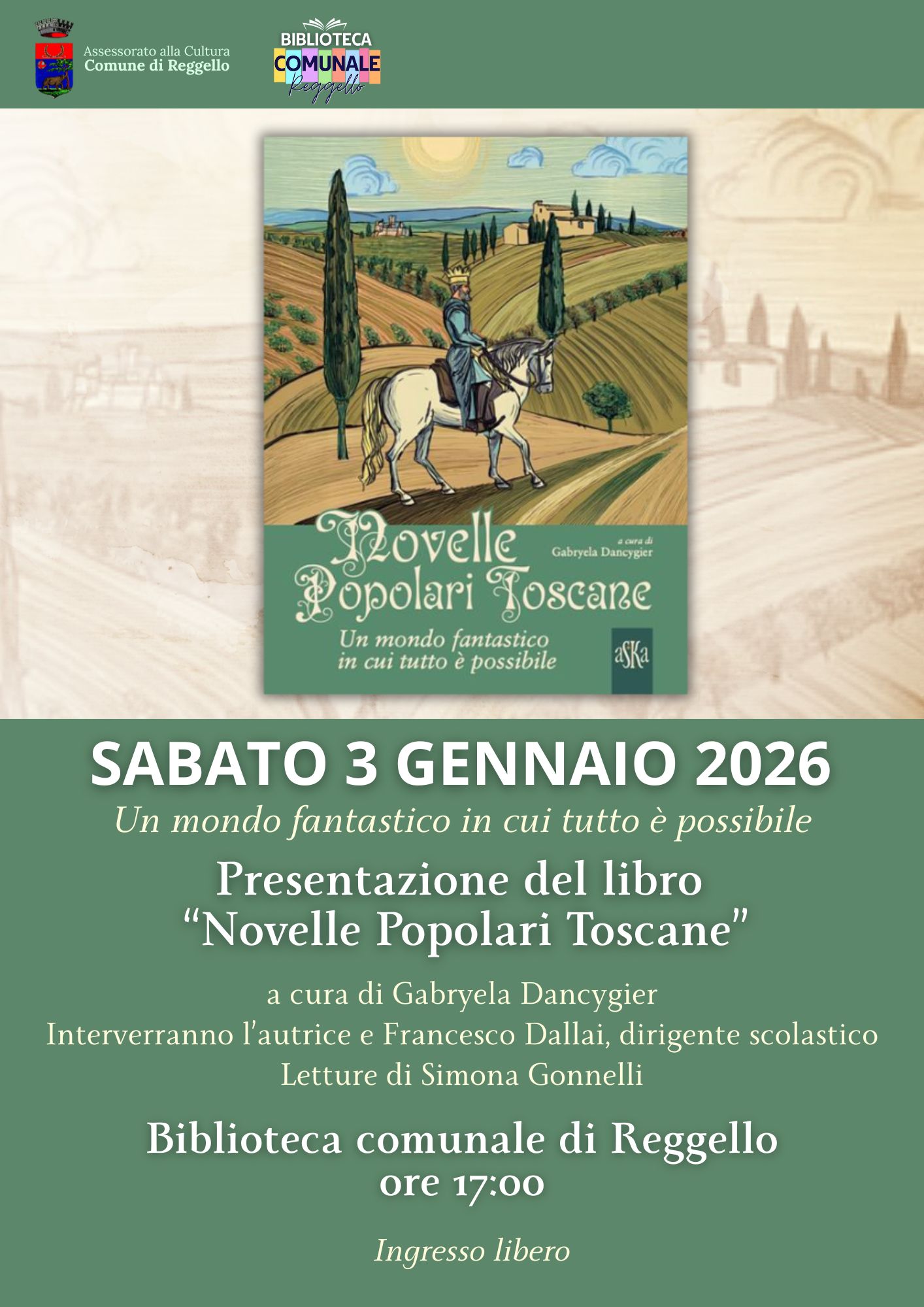 Presentazione del libro "Novelle popolari toscane"Un mondo fantastico in cui tutto è possibilePresentazione del libro "Novelle popolari toscane"Condividi Facebook Twitter Linkedin Telegram WhatsappVedi azioni Scarica Stampa E-mailTipo di eventoPresentazione libroImageNatale a Reggello 2025 2026 Cos'è a cura di Gabryela DancygierInterverranno l’autrice e Francesco Dallai, Dirigente scolastico. Letture di Simona Gonnelli A chi è rivolto a tutti/e Luogo Biblioteca comunale Via E. Berlinguer 2 - 50066 ReggelloLeggi tuttoa proposito di Biblioteca comunaleGalleria di immaginiImage202603Gen 17:00 - Inizio evento 202603Gen 19:00 - Fine evento Costo ingresso libero e gratuito Contatti Biblioteca comunale telefono 05586692520558669253 OrariWeekdayTime slotCommentoLun: 9:00-13:00 15:00-19:00Mar: 9:00-13:00 15:00-19:00Mer - Gio: 9:00-13:00 15:00-19:00Ven: 9:00-13:00 15:00-19:00 (Venerdì mattina chiuso)Sab: 9:00-13:00 15:00-19:00Dom: chiusoBiblioteca Comunale e_mail biblioteca@comune.reggello.fi.it