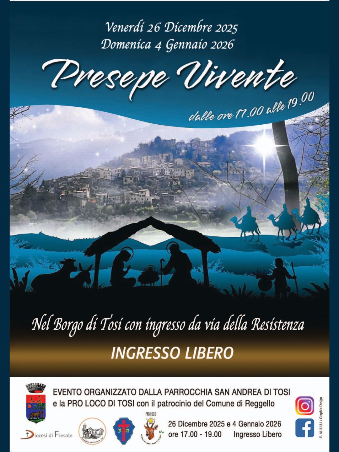 Presepe vivente a TosiCondividi Facebook Twitter Linkedin Telegram WhatsappVedi azioni Scarica Stampa E-mailTipo di eventoEvento culturaleImageNatale a Reggello 2025 2026 Cos'è Presepe vivente a Tosi A chi è rivolto a tutte/i Luogo TosiTosi - 50066 ReggelloLeggi tuttoa proposito di TosiGalleria di immaginiImage202604Gen 17:00 - Inizio evento 202604Gen 19:00 - Fine evento Costo ingresso libero Contatti Iniziative-Eventi info@comune.reggello.fi.it