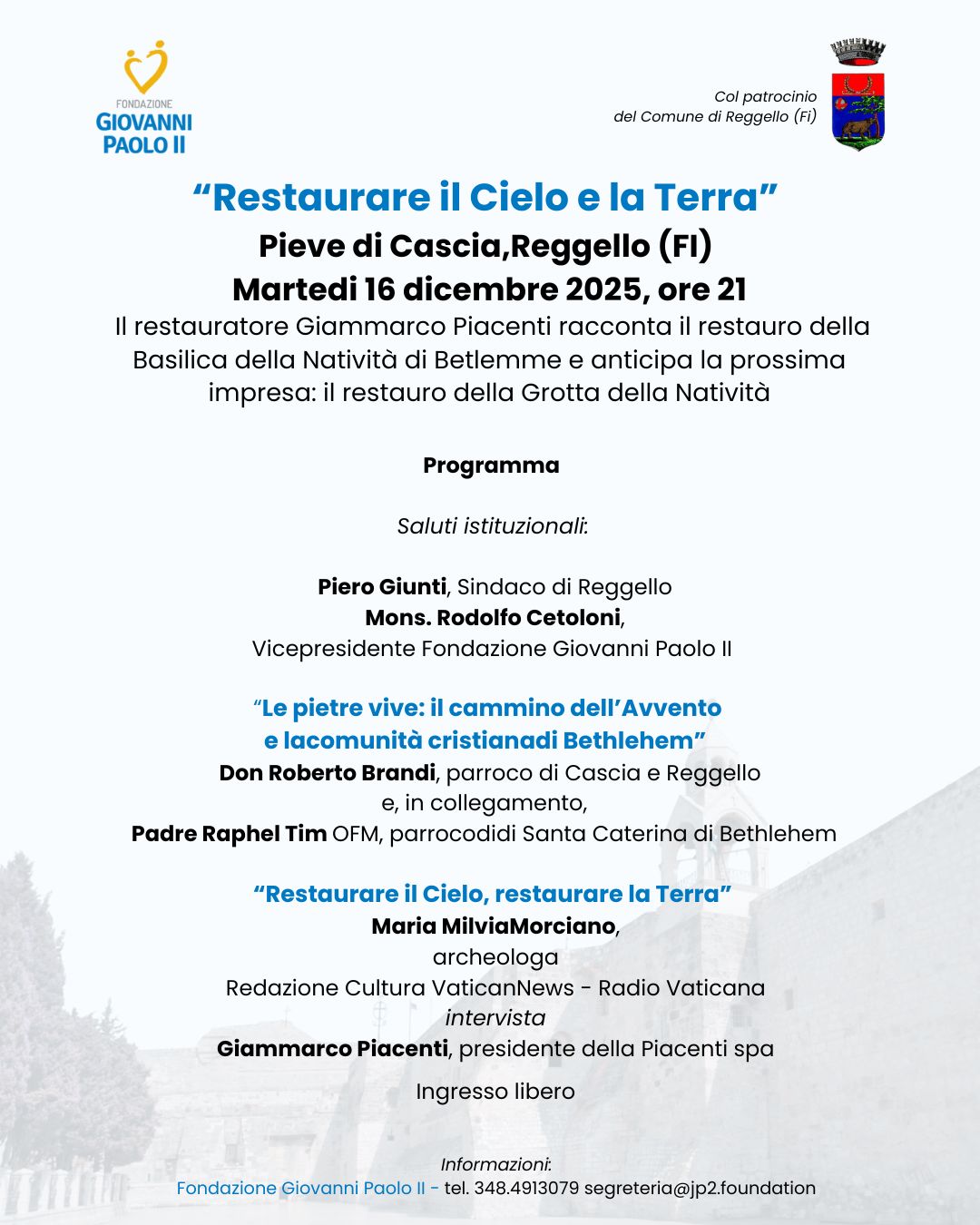 Interverrà anche Don Roberto Brandi, parroco di Cascia e Reggello, mentre in collegamento da Betlemme porterà il suo contributo Padre Raphel Tim OFM, parroco della chiesa di Santa Caterina, con una riflessione dal titolo “Le pietre vive: il cammino dell’Avvento e la comunità cristiana di Bethlehem”. Un’occasione per estendere lo sguardo oltre il restauro materiale e avvicinarsi alla dimensione umana e comunitaria dei luoghi della Natività.