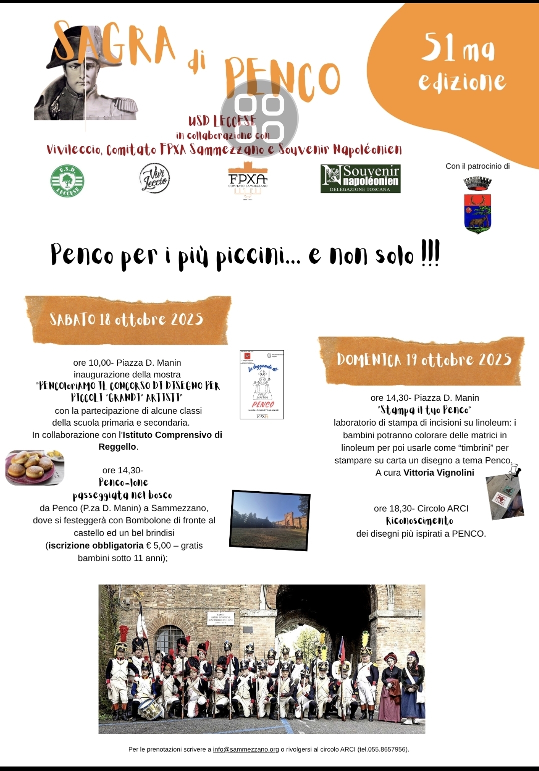 Sagra di PencoCondividi Facebook Twitter Linkedin Telegram WhatsappVedi azioni Scarica Stampa E-mailTipo di eventoEvento culturaleImagearancione eventi Cos'è Cinquantunesima edizione della Sagra di Penco. A chi è rivolto a tutti/e Luogo LeccioLeccio - 50066 ReggelloLeggi tuttoa proposito di LeccioGalleria di immaginiImageImageImage202519Ott 10:00 - Inizio evento 202519Ott 23:00 - Fine evento Costo Partecipazione rivolta a tutta la cittadinanza Allegati Document Penco Mostra fotograficaORIZZONTALE (1).pdf (4.37 MB)Document per i più piccoli OK (1)_0.pdf (1.01 MB) Contatti Iniziative-Eventi info@comune.reggello.fi.it