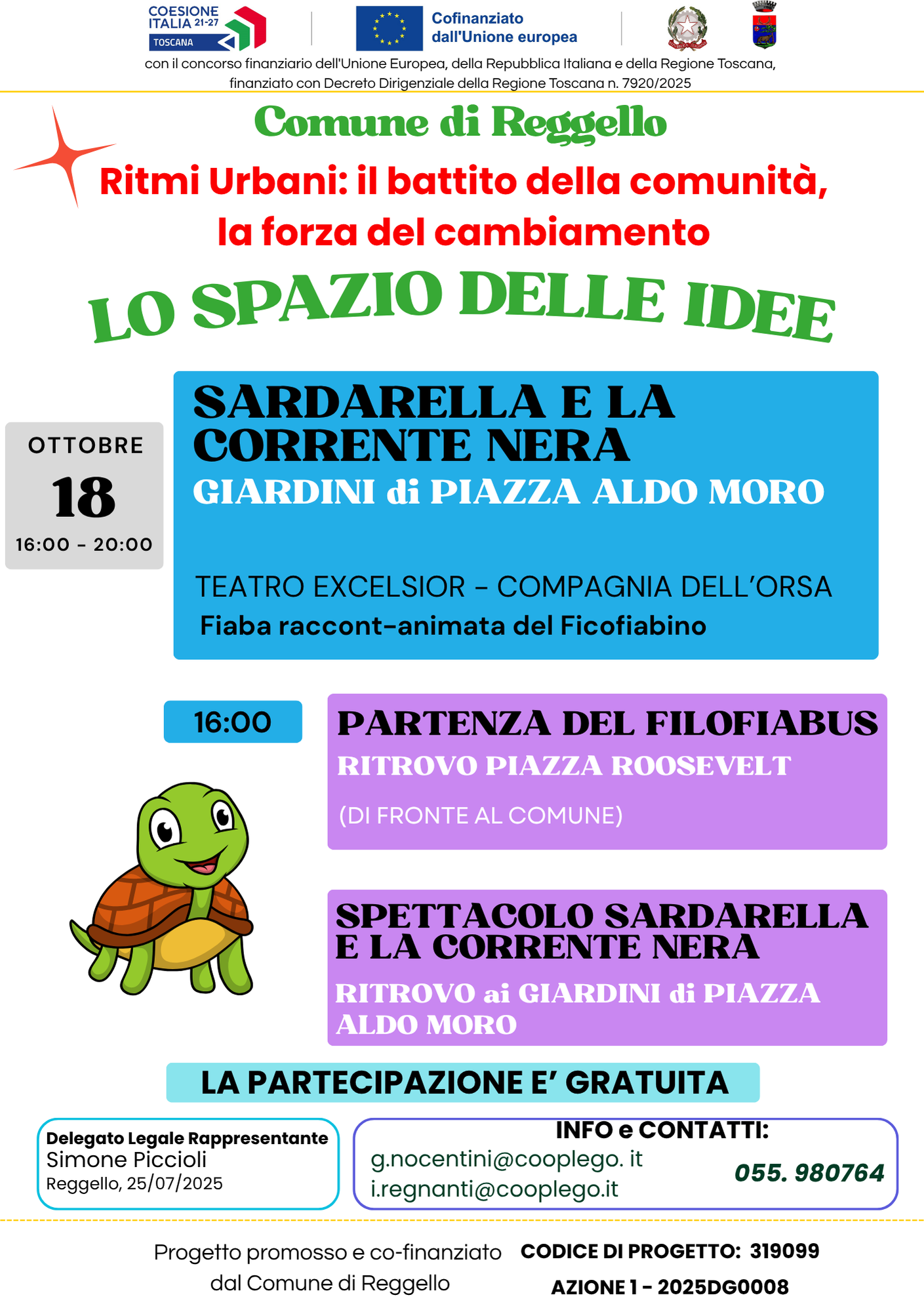 Venerdì 18 ottobre, dalle ore 16 alle 20, al Teatro Excelsior di Reggello andrà in scena lo spettacolo teatrale “Sardarella e la corrente nera”, a cura della Società Cooperativa Sociale LEGO, con la partecipazione della Compagnia dell’Orsa.