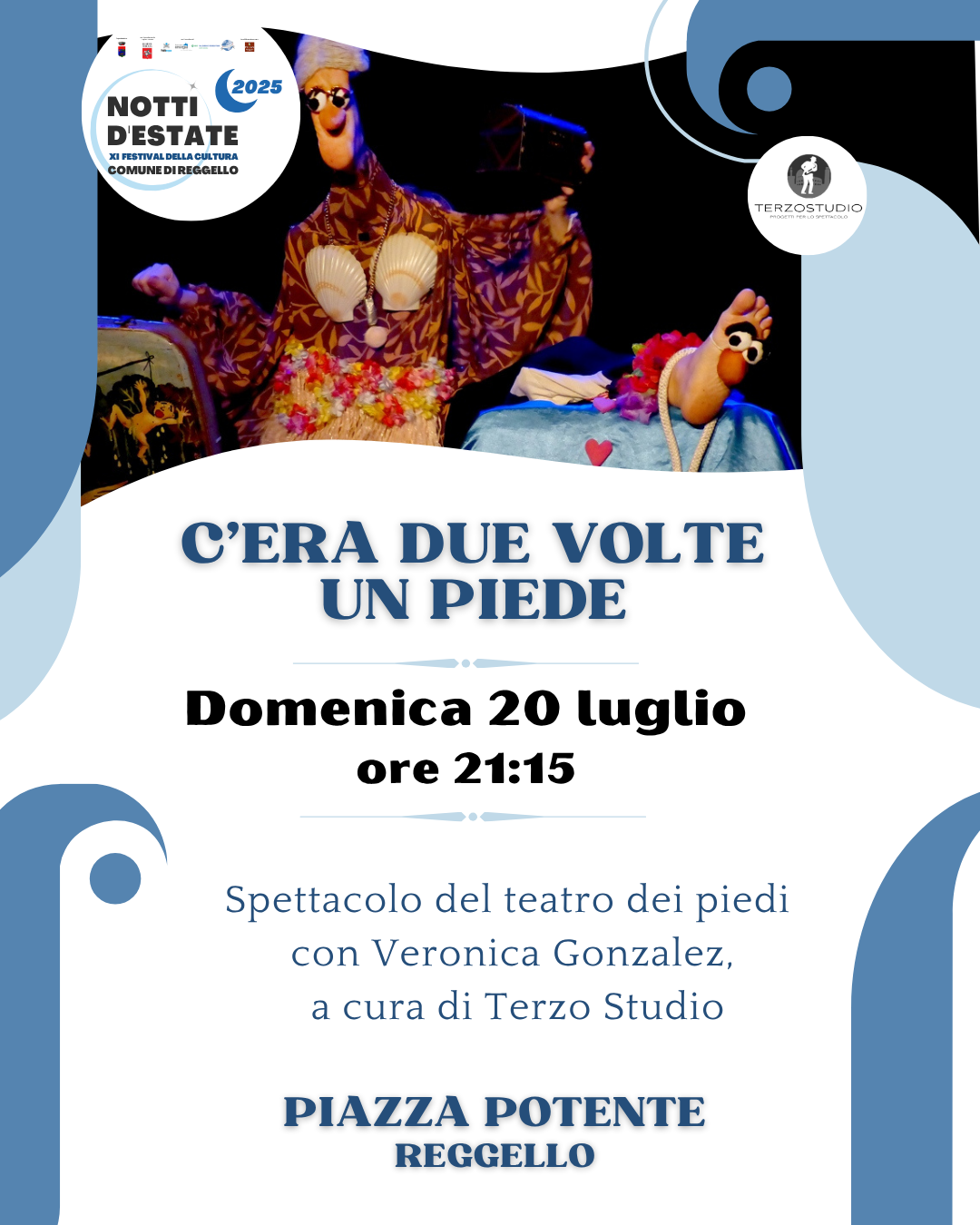 Spettacolo “C’era due volte un piede” di Veronica Gonzalez – a cura di TerzoStudioCondividi Facebook Twitter Linkedin Telegram WhatsappVedi azioni Scarica Stampa E-mailTipo di eventoManifestazione artisticaImageviola ok eventi Cos'è Spettacolo “C’era due volte un piede” di Veronica Gonzalez – a cura di TerzoStudio A chi è rivolto a tutta la cittadinanza Luogo Piazza Potentepiazza Potente - 50066 ReggelloLeggi tuttoa proposito di Piazza PotenteGalleria di immaginiImage202520Lug 21:15 - Inizio evento 202520Lug 23:30 - Fine evento Costo nessun costo Contatti Iniziative-Eventi info@comune.reggello.fi.it