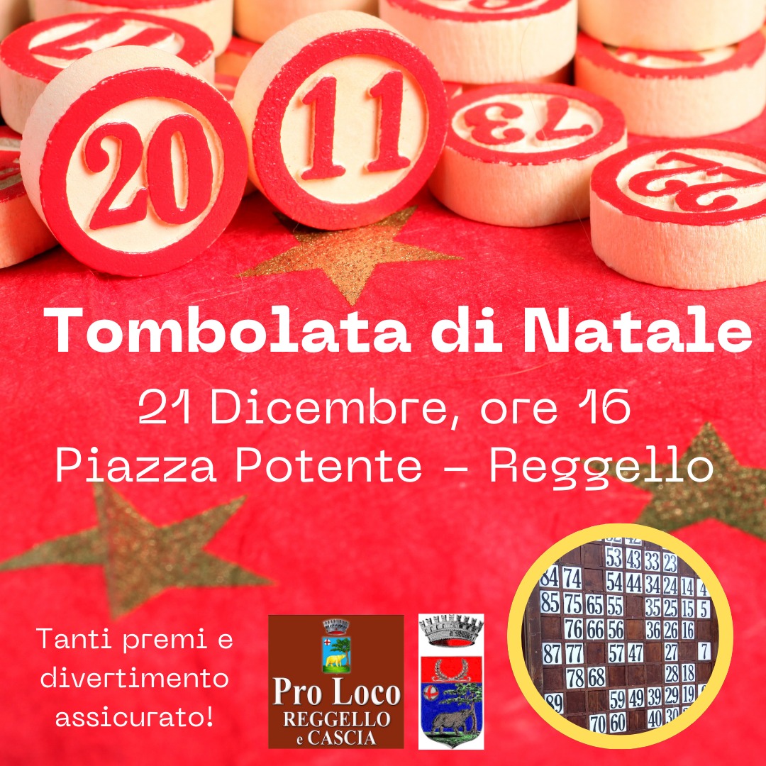 Tombolata di NataleCondividi Facebook Twitter Linkedin Telegram WhatsappVedi azioni Scarica Stampa E-mailTipo di eventoEvento culturaleImageNatale a Reggello 2025 2026 Cos'è Tombolata di Natale a cura di Proloco Reggello e Cascia A chi è rivolto a tutte/i Luogo Piazza Potentepiazza Potente - 50066 ReggelloLeggi tuttoa proposito di Piazza PotenteGalleria di immaginiImage202521Dic 16:00 - Inizio evento 202521Dic 18:00 - Fine evento Costo ingresso libero Contatti Proloco Reggello e Cascia info@prolocoreggellocascia.it